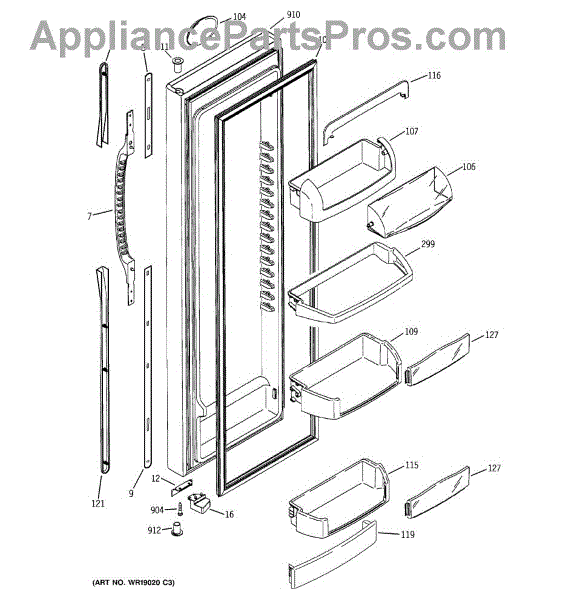 The Door Bin is an OEM part for GE refrigerators. It is a convenient storage compartment located on the interior of the refrigerator door, designed to hold and organize smaller items such as condiments, jars, or beverages.