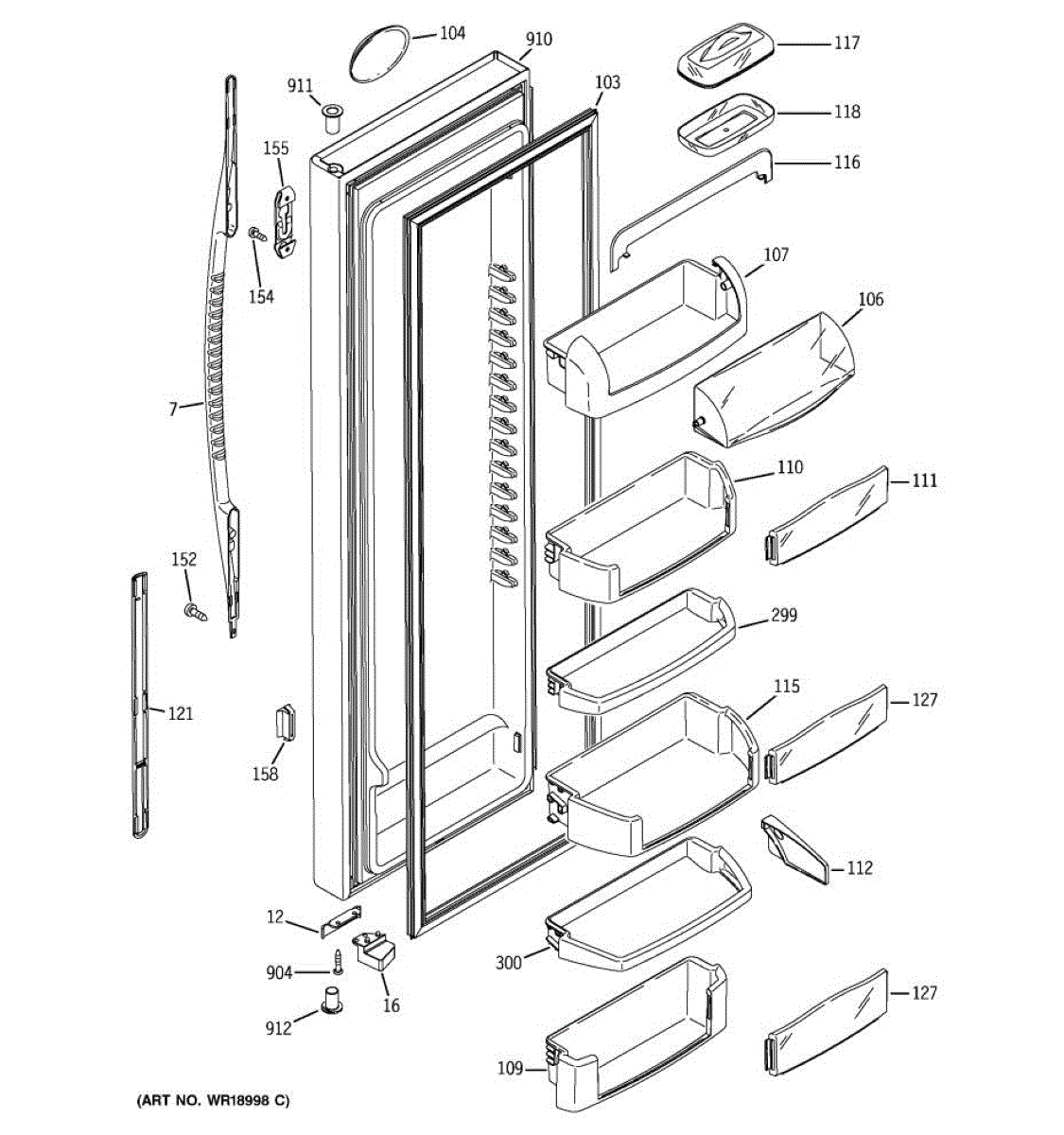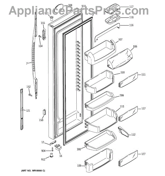 The Door Bin is an OEM part for GE refrigerators. It is a convenient storage compartment located on the interior of the refrigerator door, designed to hold and organize smaller items such as condiments, jars, or beverages.