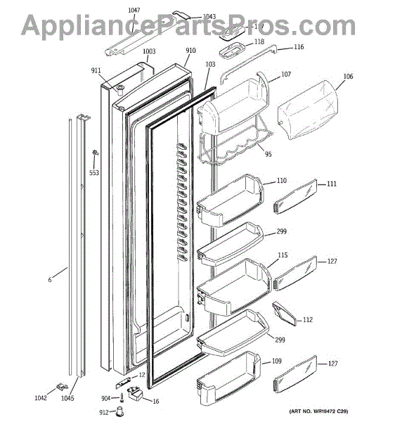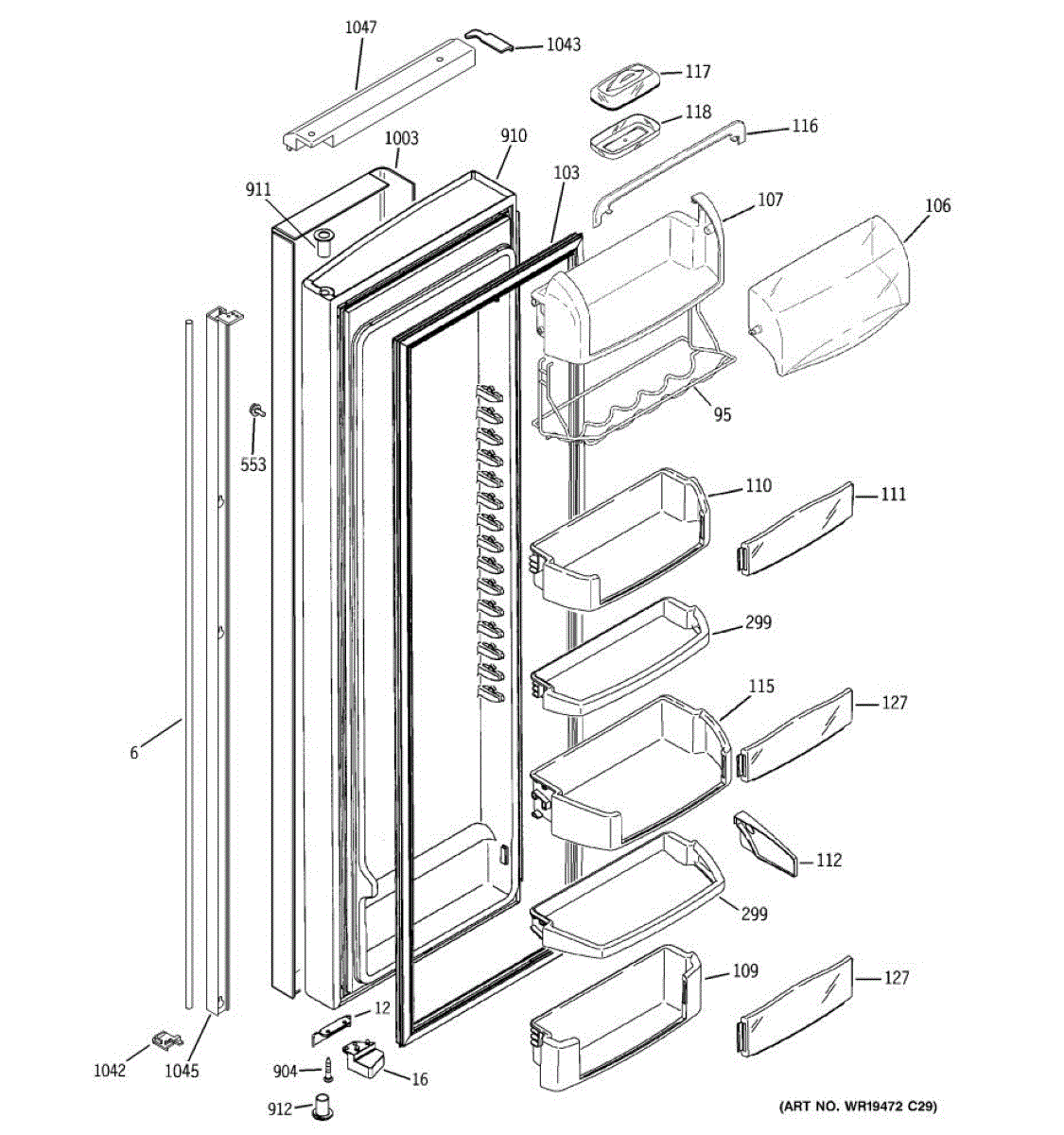 The Door Bin is an OEM part for GE refrigerators. It is a convenient storage compartment located on the interior of the refrigerator door, designed to hold and organize smaller items such as condiments, jars, or beverages.