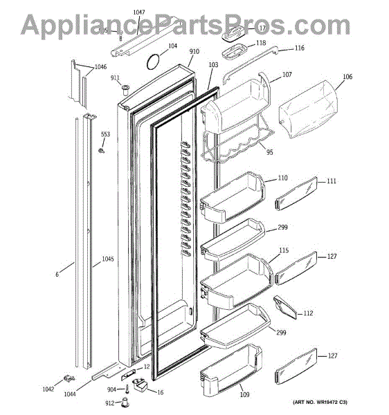 The Door Bin is an OEM part for GE refrigerators. It is a convenient storage compartment located on the interior of the refrigerator door, designed to hold and organize smaller items such as condiments, jars, or beverages.