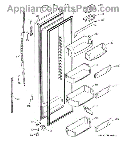 The Door Bin is an OEM part for GE refrigerators. It is a convenient storage compartment located on the interior of the refrigerator door, designed to hold and organize smaller items such as condiments, jars, or beverages.