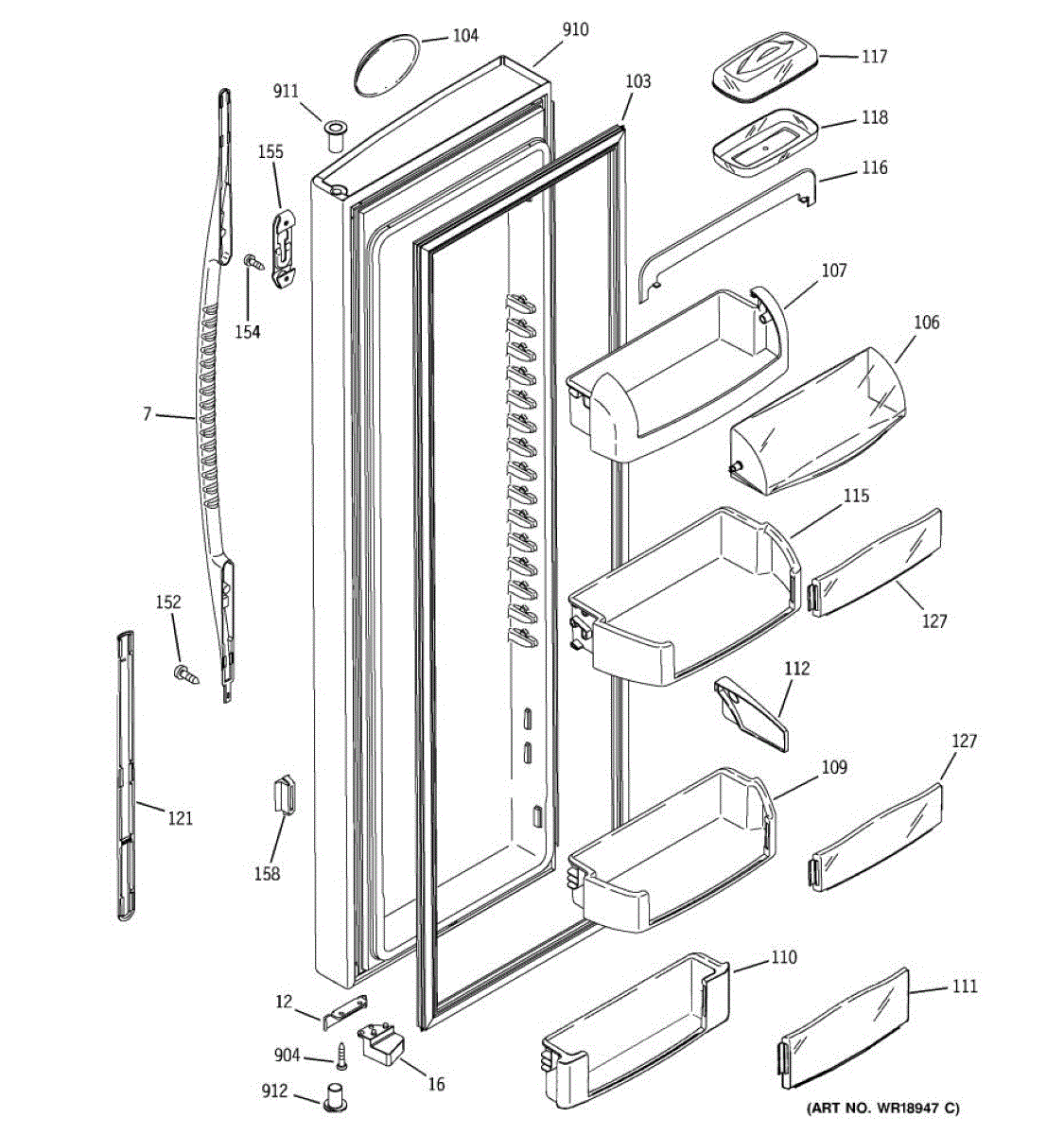 The Door Bin is an OEM part for GE refrigerators. It is a convenient storage compartment located on the interior of the refrigerator door, designed to hold and organize smaller items such as condiments, jars, or beverages.
