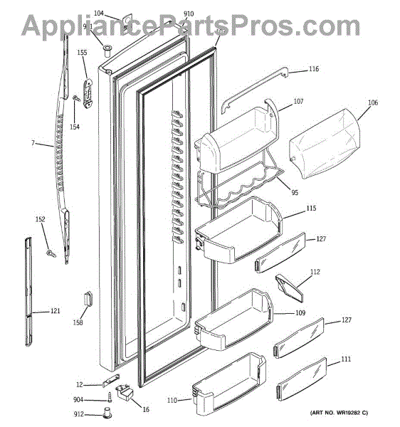 The Door Bin is an OEM part for GE refrigerators. It is a convenient storage compartment located on the interior of the refrigerator door, designed to hold and organize smaller items such as condiments, jars, or beverages.
