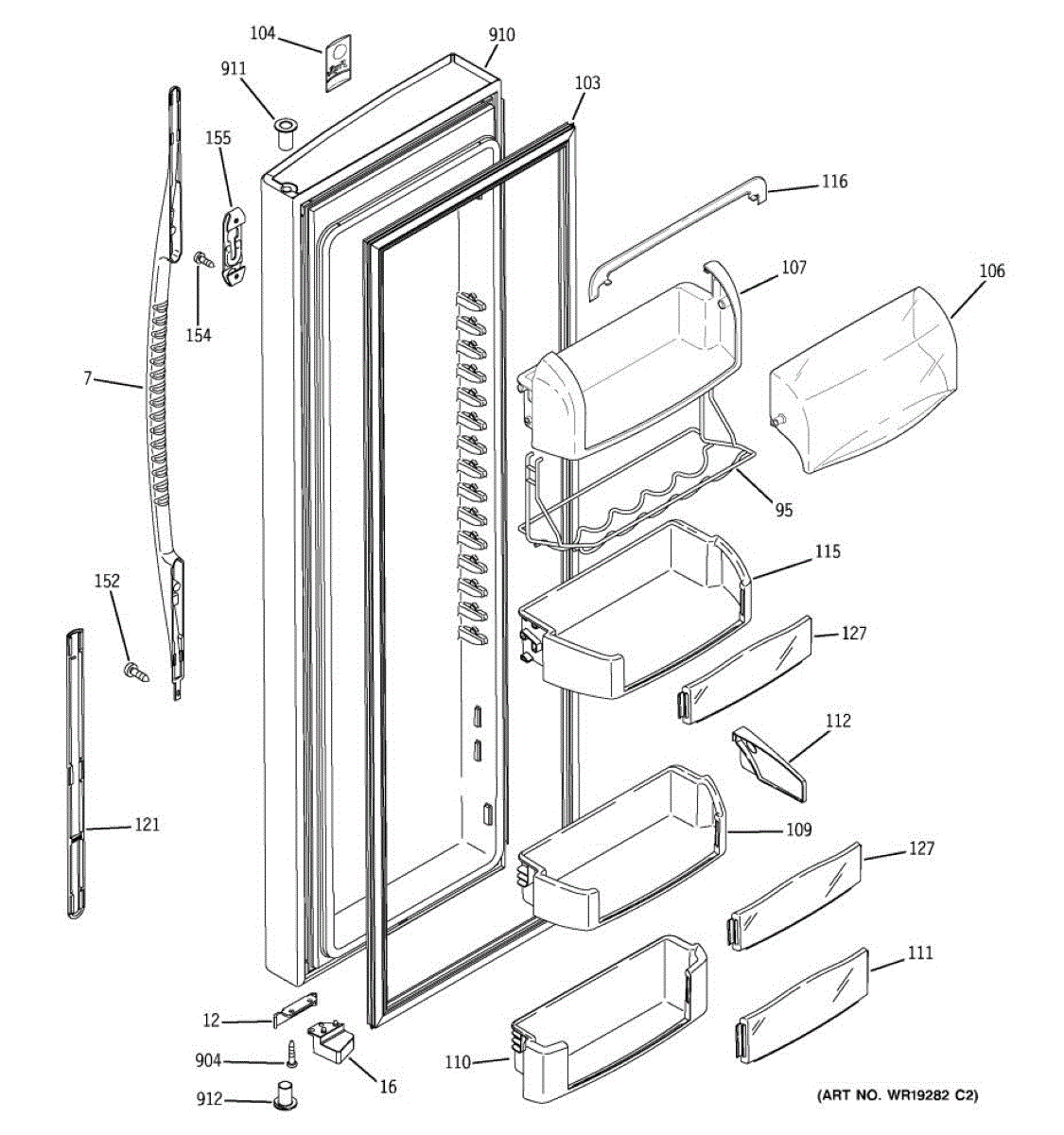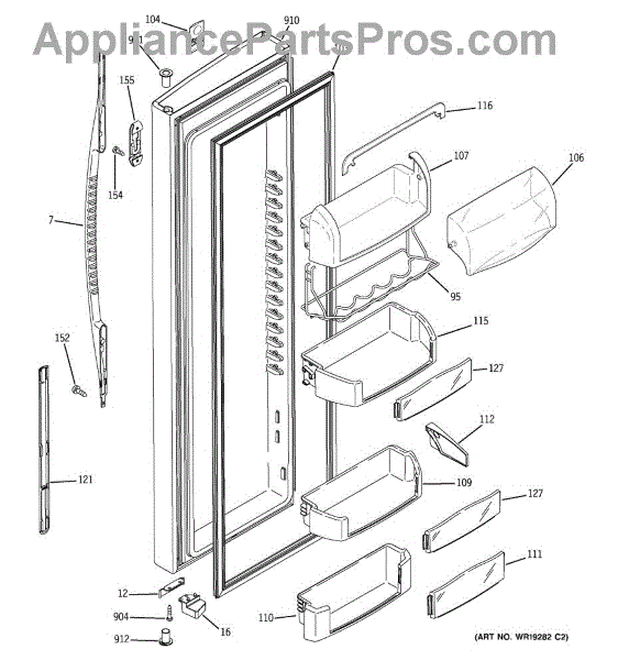 The Door Bin is an OEM part for GE refrigerators. It is a convenient storage compartment located on the interior of the refrigerator door, designed to hold and organize smaller items such as condiments, jars, or beverages.
