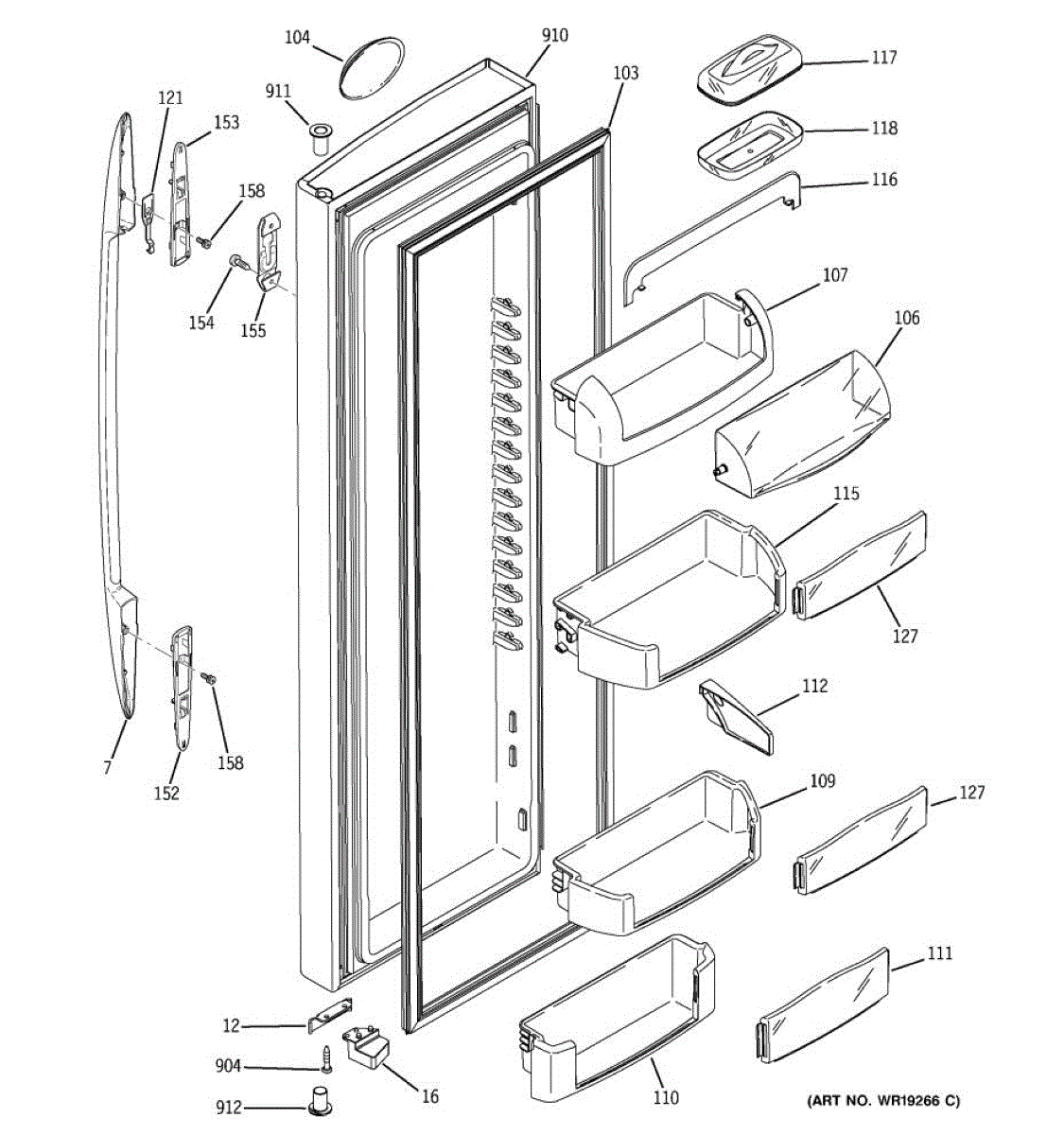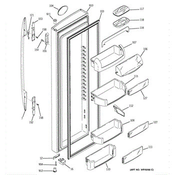 The Door Bin is an OEM part for GE refrigerators. It is a convenient storage compartment located on the interior of the refrigerator door, designed to hold and organize smaller items such as condiments, jars, or beverages.
