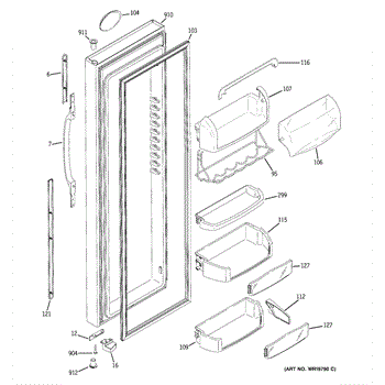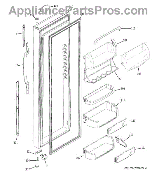 The Door Bin is an OEM part for GE refrigerators. It is a convenient storage compartment located on the interior of the refrigerator door, designed to hold and organize smaller items such as condiments, jars, or beverages.