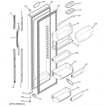 The Door Bin is an OEM part for GE refrigerators. It is a convenient storage compartment located on the interior of the refrigerator door, designed to hold and organize smaller items such as condiments, jars, or beverages.