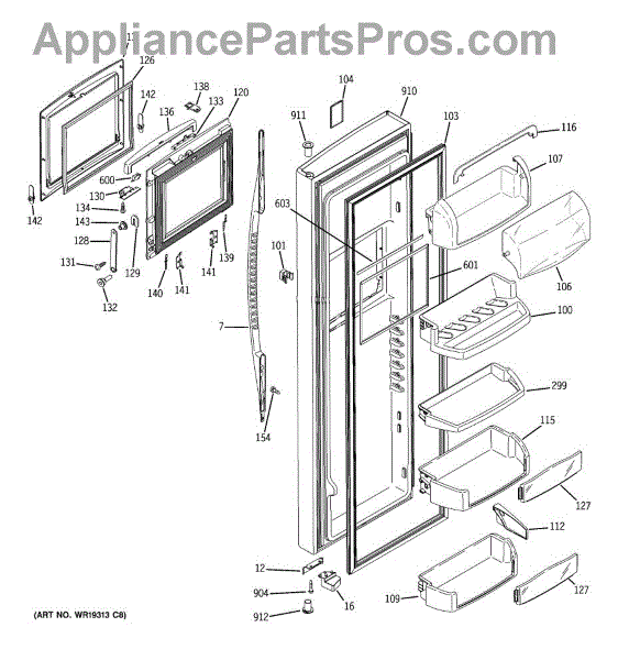 The Door Bin is an OEM part for GE refrigerators. It is a convenient storage compartment located on the interior of the refrigerator door, designed to hold and organize smaller items such as condiments, jars, or beverages.