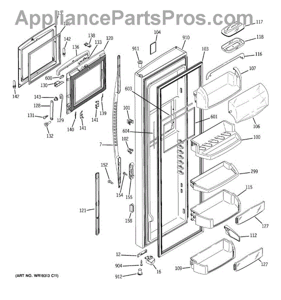 The Door Bin is an OEM part for GE refrigerators. It is a convenient storage compartment located on the interior of the refrigerator door, designed to hold and organize smaller items such as condiments, jars, or beverages.