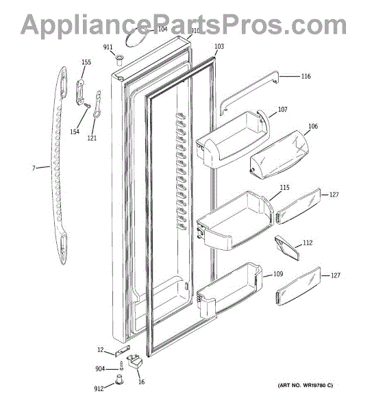 The Door Bin is an OEM part for GE refrigerators. It is a convenient storage compartment located on the interior of the refrigerator door, designed to hold and organize smaller items such as condiments, jars, or beverages.
