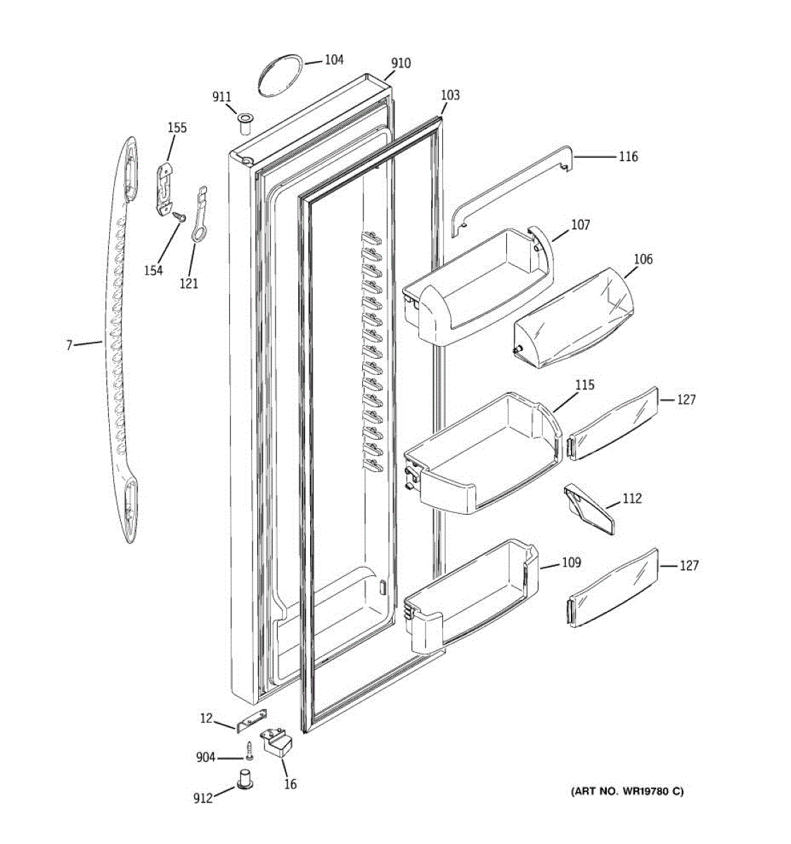 The Door Bin is an OEM part for GE refrigerators. It is a convenient storage compartment located on the interior of the refrigerator door, designed to hold and organize smaller items such as condiments, jars, or beverages.