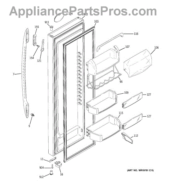 The Door Bin is an OEM part for GE refrigerators. It is a convenient storage compartment located on the interior of the refrigerator door, designed to hold and organize smaller items such as condiments, jars, or beverages.