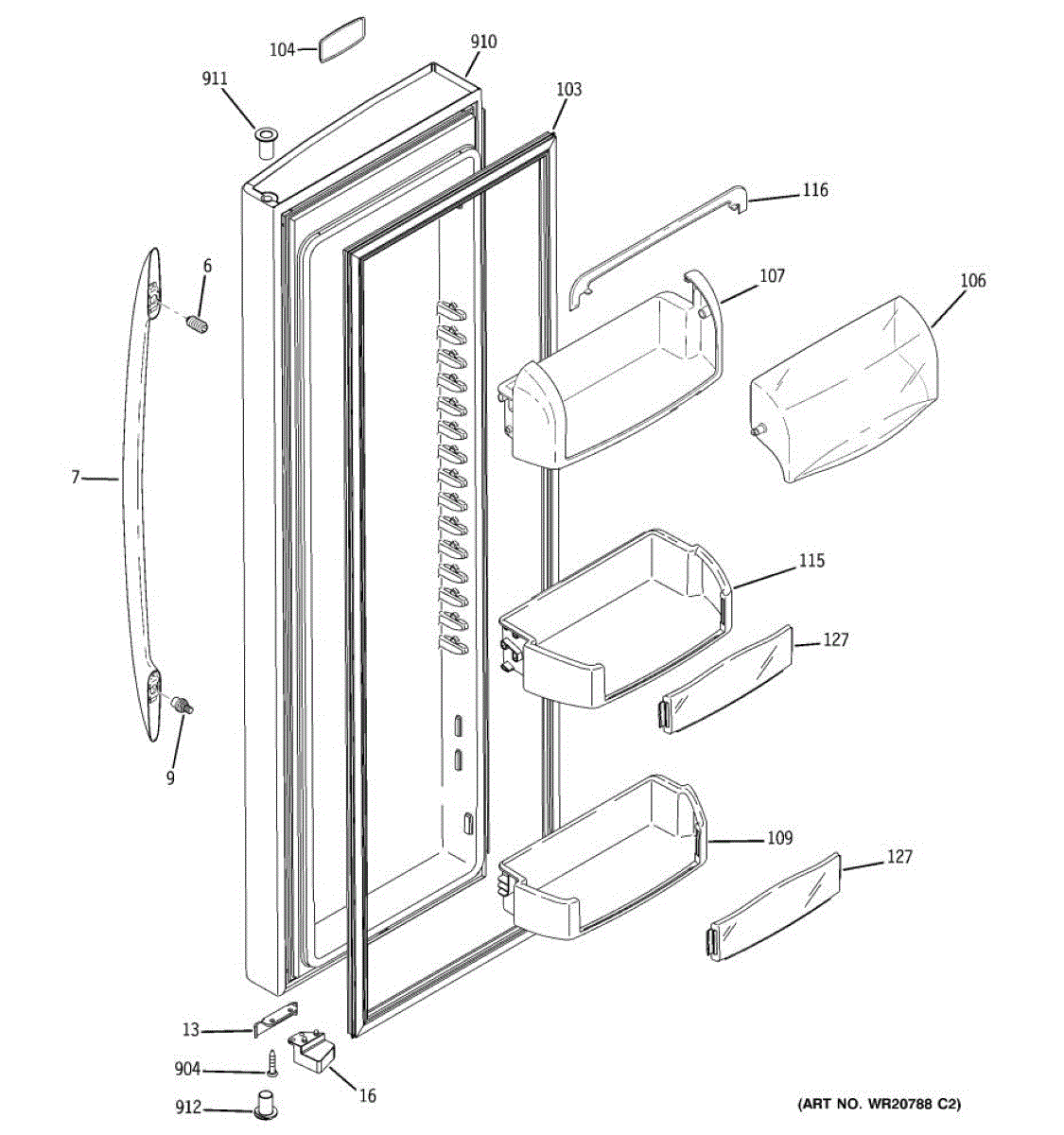 The Door Bin is an OEM part for GE refrigerators. It is a convenient storage compartment located on the interior of the refrigerator door, designed to hold and organize smaller items such as condiments, jars, or beverages.