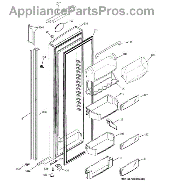 The Door Bin is an OEM part for GE refrigerators. It is a convenient storage compartment located on the interior of the refrigerator door, designed to hold and organize smaller items such as condiments, jars, or beverages.