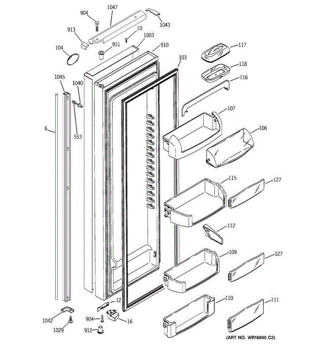 The Door Bin is an OEM part for GE refrigerators. It is a convenient storage compartment located on the interior of the refrigerator door, designed to hold and organize smaller items such as condiments, jars, or beverages.