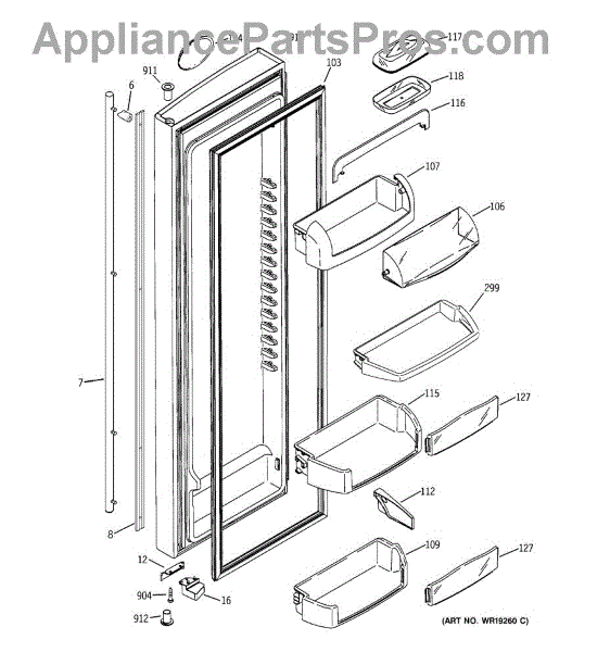 The Door Bin is an OEM part for GE refrigerators. It is a convenient storage compartment located on the interior of the refrigerator door, designed to hold and organize smaller items such as condiments, jars, or beverages.