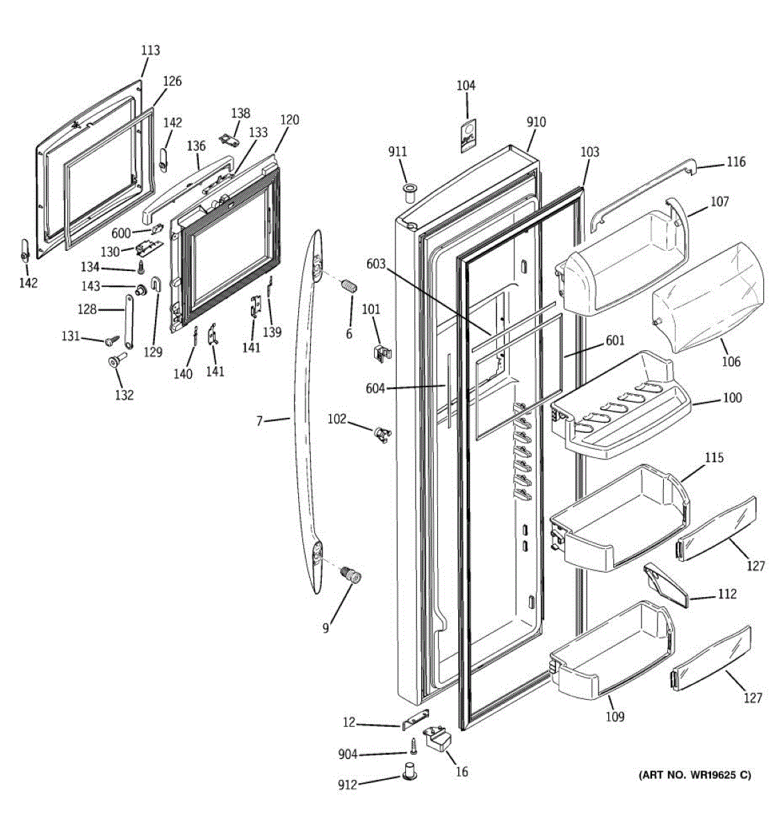 The Door Bin is an OEM part for GE refrigerators. It is a convenient storage compartment located on the interior of the refrigerator door, designed to hold and organize smaller items such as condiments, jars, or beverages.
