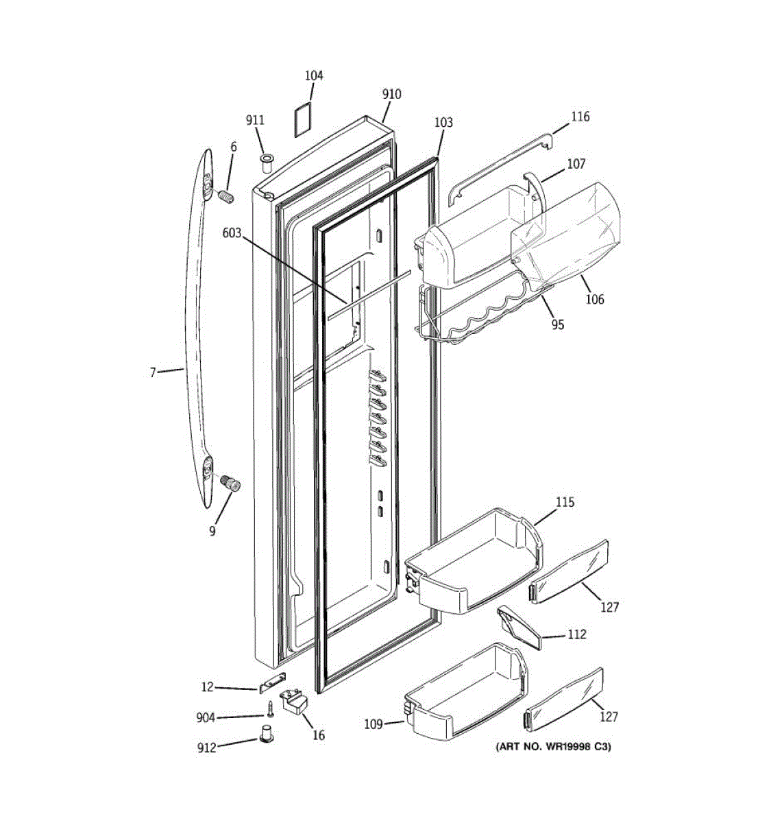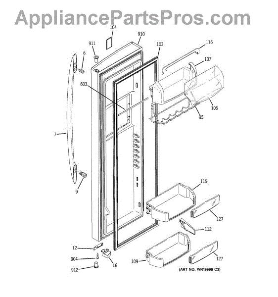 The Door Bin is an OEM part for GE refrigerators. It is a convenient storage compartment located on the interior of the refrigerator door, designed to hold and organize smaller items such as condiments, jars, or beverages.