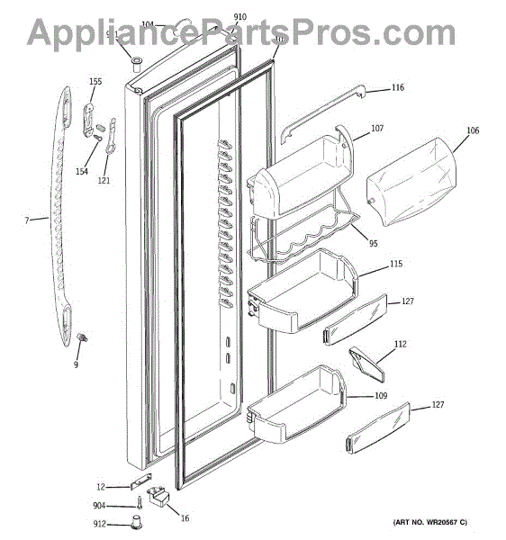 The Door Bin is an OEM part for GE refrigerators. It is a convenient storage compartment located on the interior of the refrigerator door, designed to hold and organize smaller items such as condiments, jars, or beverages.