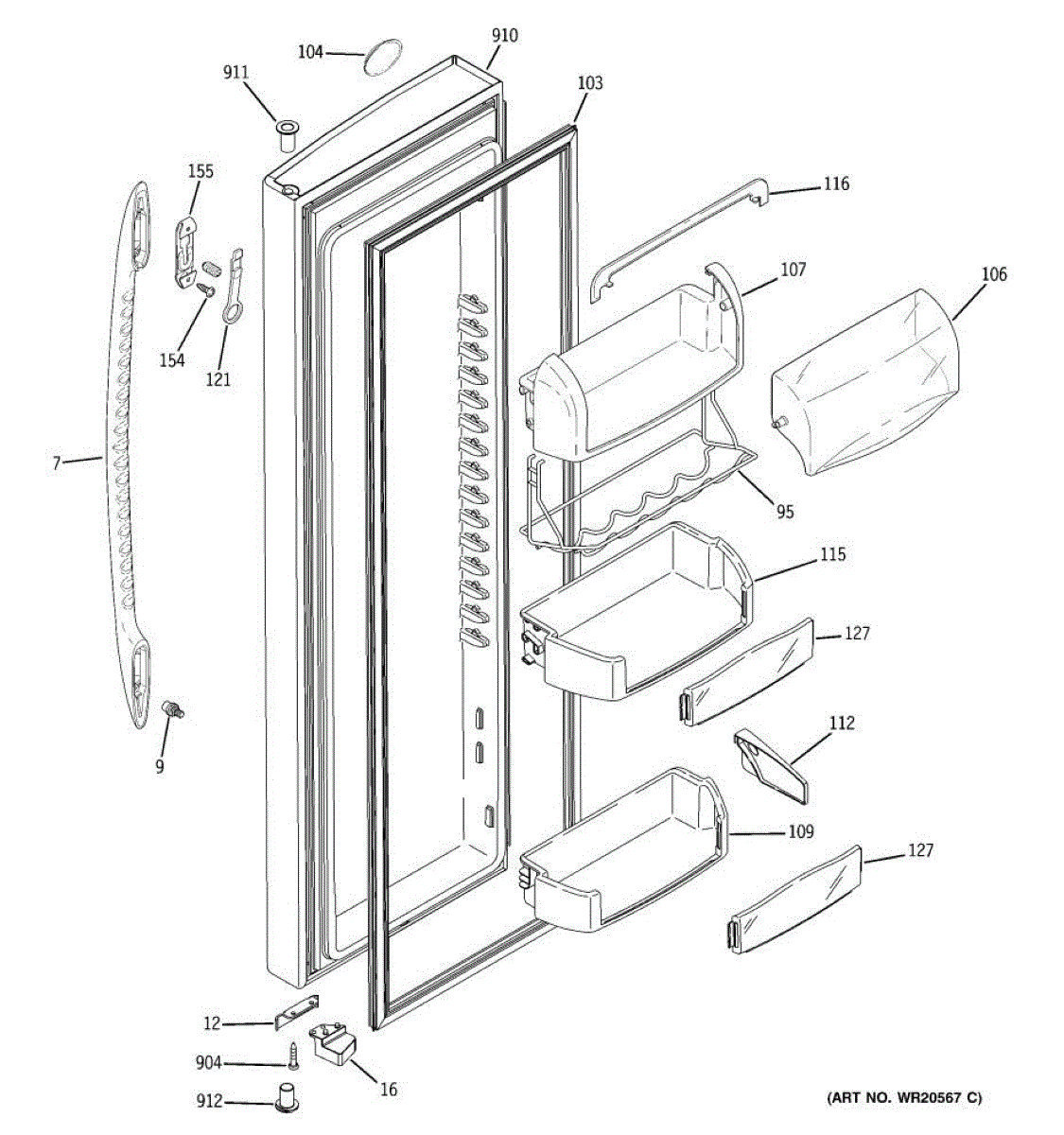 The Door Bin is an OEM part for GE refrigerators. It is a convenient storage compartment located on the interior of the refrigerator door, designed to hold and organize smaller items such as condiments, jars, or beverages.