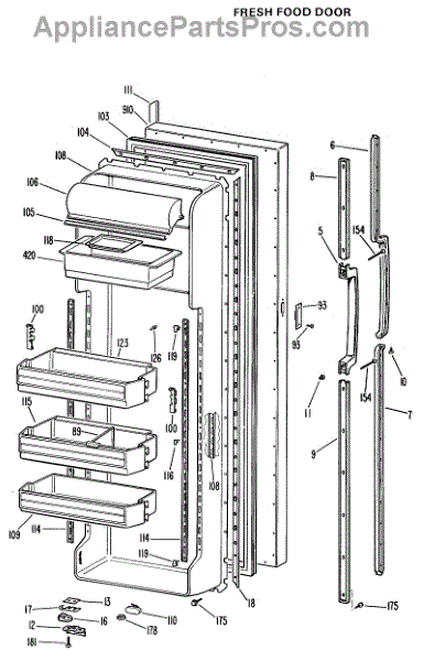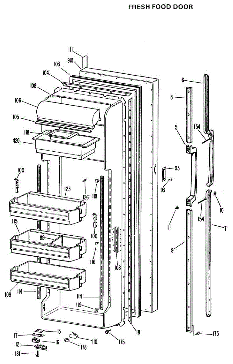 Refrigerator door handle assembly. Installs on the exterior door to provide grip for opening. Replace if cracked, broken, loose, or missing.