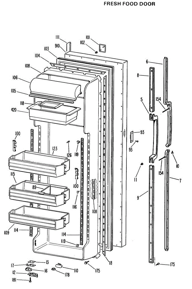 Refrigerator door handle assembly. Installs on the exterior door to provide grip for opening. Replace if cracked, broken, loose, or missing.