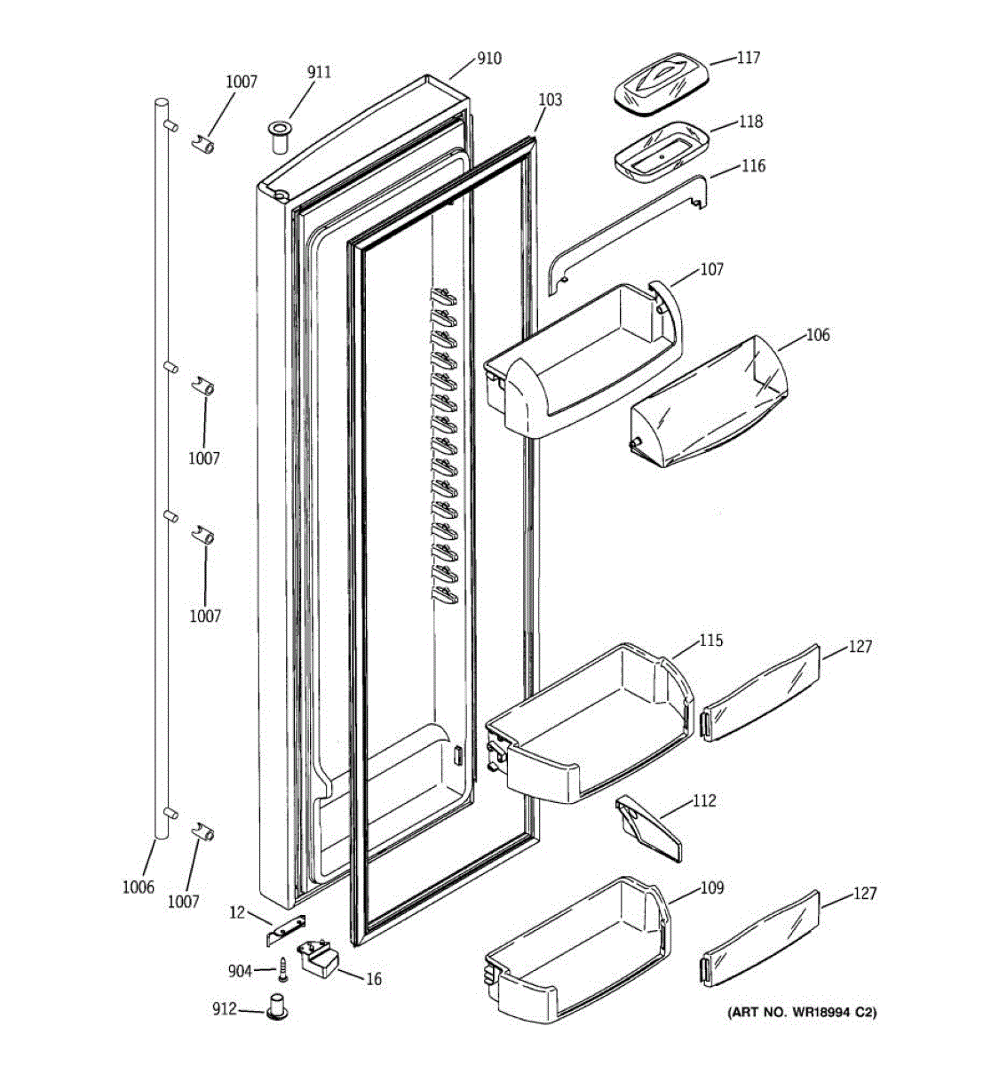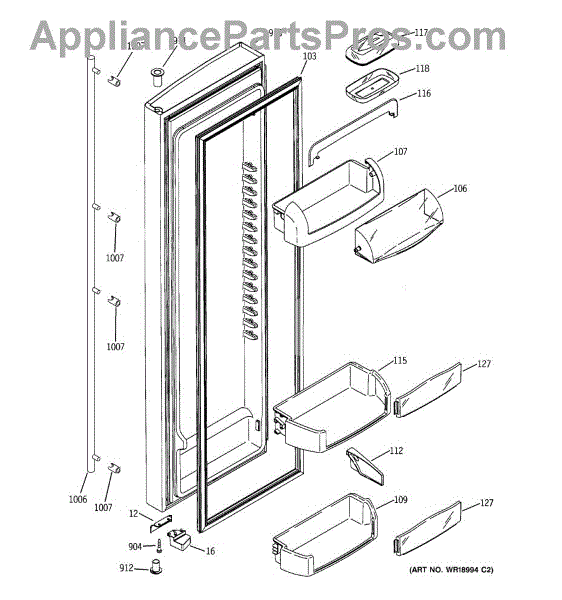 The Door Bin is an OEM part for GE refrigerators. It is a convenient storage compartment located on the interior of the refrigerator door, designed to hold and organize smaller items such as condiments, jars, or beverages.