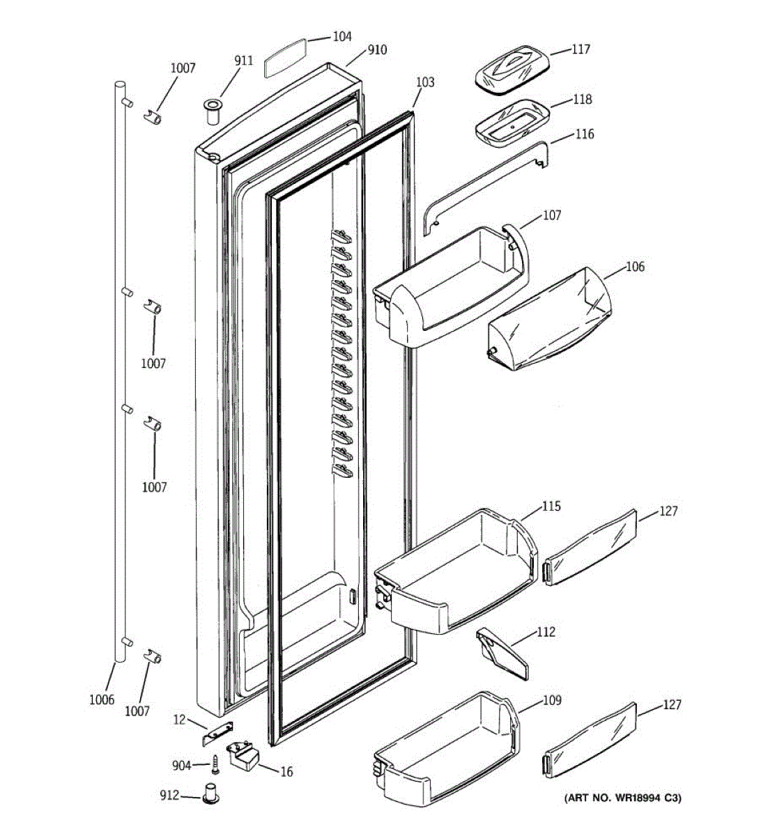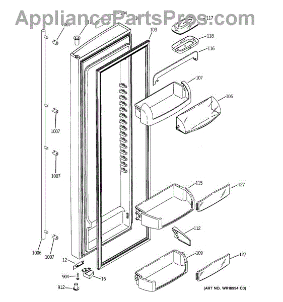 The Door Bin is an OEM part for GE refrigerators. It is a convenient storage compartment located on the interior of the refrigerator door, designed to hold and organize smaller items such as condiments, jars, or beverages.