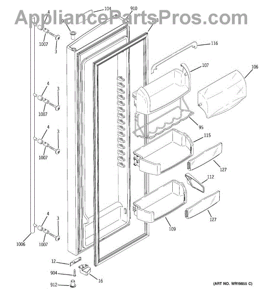 The Door Bin is an OEM part for GE refrigerators. It is a convenient storage compartment located on the interior of the refrigerator door, designed to hold and organize smaller items such as condiments, jars, or beverages.