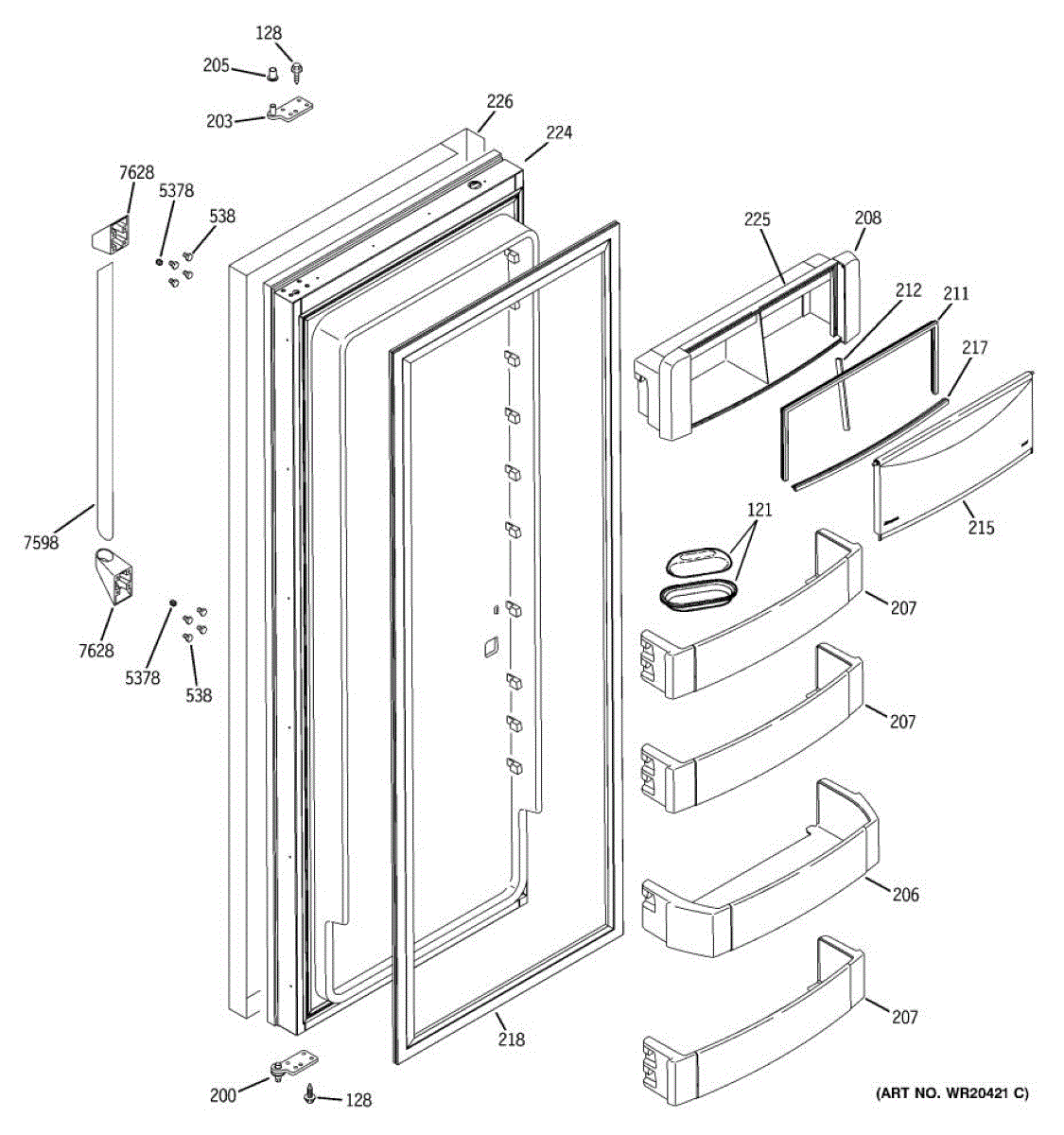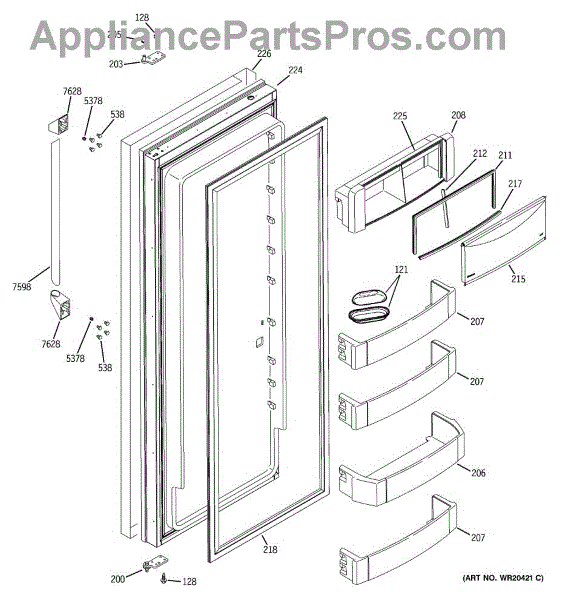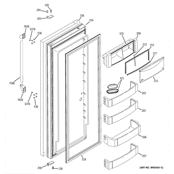 The Door Bin Assembly is an OEM component for GE refrigerators. This component is designed to attach to the interior side of the refrigerator door, providing additional storage space for items such as condiments, beverages, and other frequently accessed products. The assembly is crafted to hold items securely while optimizing space usage within the refrigerator.