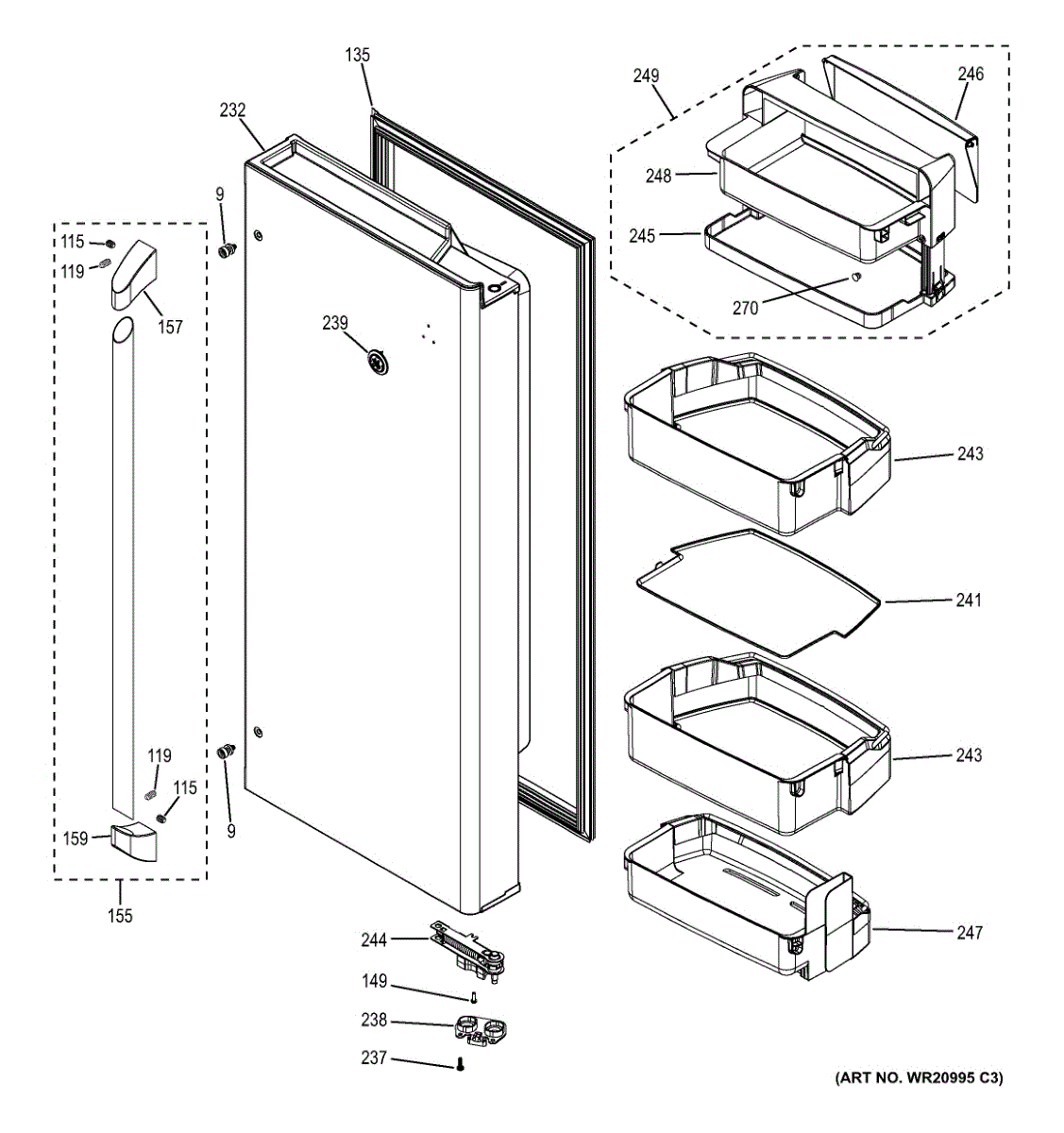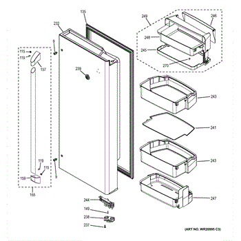 Right hand door for refrigerators. Provides access to fresh food compartment. Replace if cracked, damaged, or broken. Includes mounting points for handle.