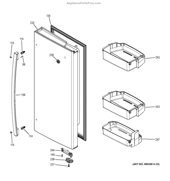 Right door bin for bottom-mount refrigerators. Mounts inside the door to organize beverages, condiments, and small containers. Replace if cracked or missing.