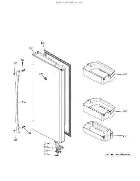 The Right Door Bin is an OEM part for GE refrigerators. It is a storage compartment located on the right side of the refrigerator door, designed to hold various items such as beverages, condiments, or small containers. This assembly provides convenient access and organization within the door, allowing for efficient use of space.
