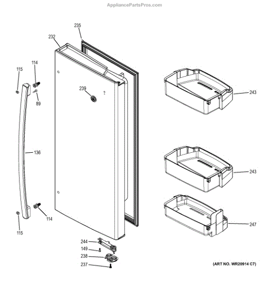 The Right Door Bin is an OEM part for GE refrigerators. It is a storage compartment located on the right side of the refrigerator door, designed to hold various items such as beverages, condiments, or small containers. This assembly provides convenient access and organization within the door, allowing for efficient use of space.