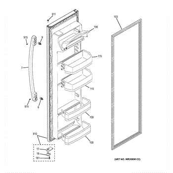 Replacement door bin for side-by-side refrigerators. Installs on the inner door to store condiments, bottles, and jars. Replace if cracked or broken.