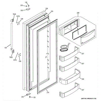 The Door Bin Assembly is an OEM component for GE refrigerators. This component is designed to attach to the interior side of the refrigerator door, providing additional storage space for items such as condiments, beverages, and other frequently accessed products. The assembly is crafted to hold items securely while optimizing space usage within the refrigerator.