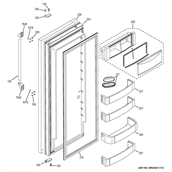 The Door Bin Assembly is an OEM component for GE refrigerators. This component is designed to attach to the interior side of the refrigerator door, providing additional storage space for items such as condiments, beverages, and other frequently accessed products. The assembly is crafted to hold items securely while optimizing space usage within the refrigerator.