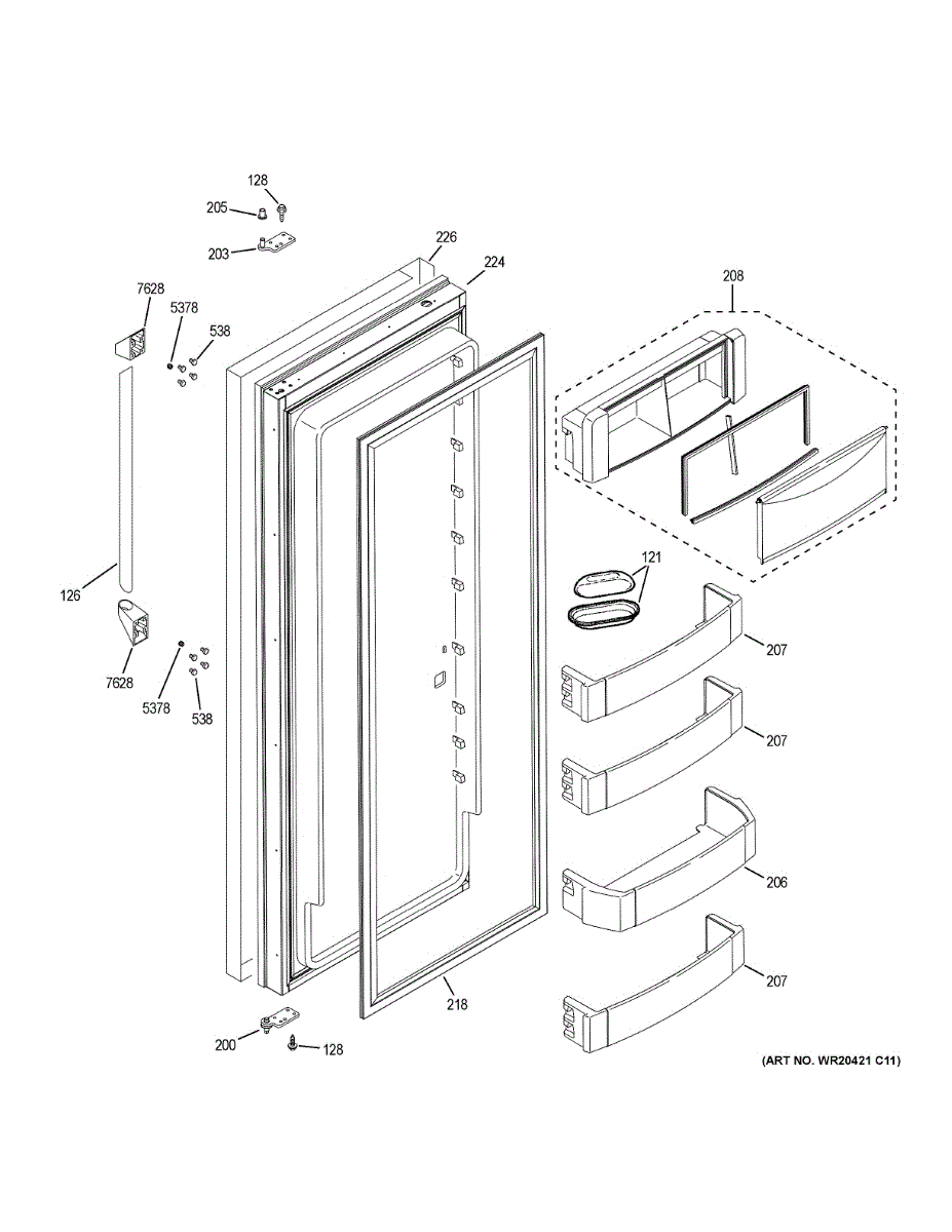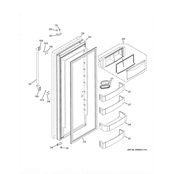 The Door Bin Assembly is an OEM component for GE refrigerators. This component is designed to attach to the interior side of the refrigerator door, providing additional storage space for items such as condiments, beverages, and other frequently accessed products. The assembly is crafted to hold items securely while optimizing space usage within the refrigerator.
