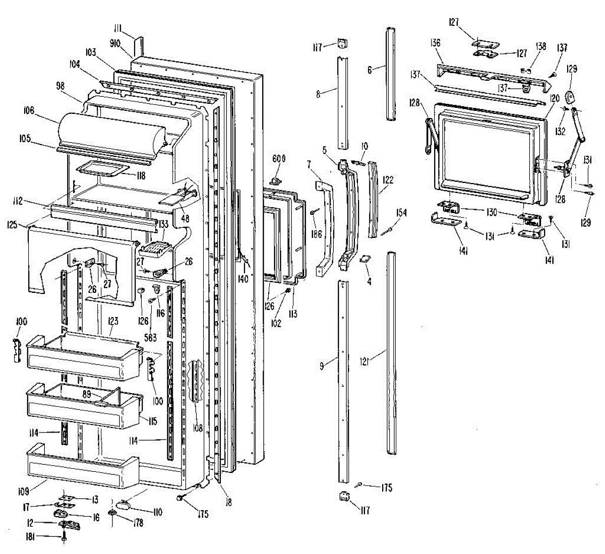 Hardware fasteners for securing refrigerator door panels and components. Includes screws, nuts, and washers for assembly. Replace missing or stripped pieces.