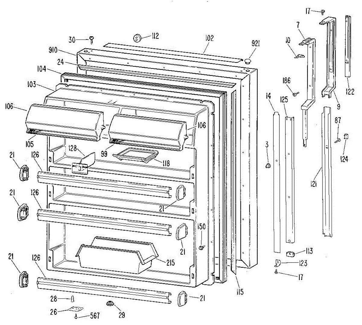 Hardware fasteners for securing refrigerator door panels and components. Includes screws, nuts, and washers for assembly. Replace missing or stripped pieces.