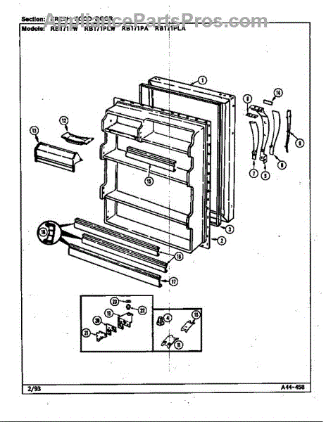 Washer for refrigerators. Installs between screws and mounting surfaces to distribute pressure and prevent damage. Replace if missing, worn, or cracked.