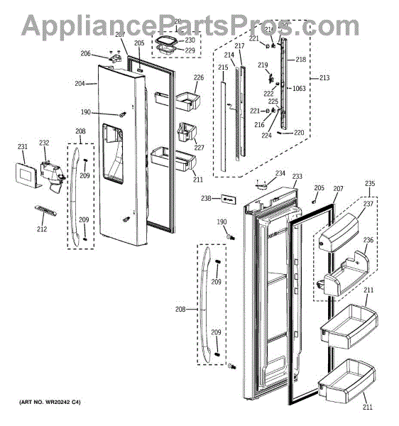 This is an ice chute and funnel assembly for refrigerators with ice dispensers on their doors. The chute opens upon the user's command input and releases ice into a glass or other container placed underneath it. With use, because of misuse, or as a result of accidental damage, part or all of the ice chute door and funnel may malfunction or fail entirely. When this happens, a replacement part is required to continue using the ice dispensing feature.If the ice chute no longer dispenses ice, or if it is dispensing too much or too little ice, it's a good indication that there is something wrong with this part of the appliance. It's a quick repair. It is always recommended to unplug the device before beginning the replacement. Move any food that could spoil while the repair is being completed.This refrigerator ice dispenser ice chute door and funnel assembly is a genuine OEM replacement part. It is sourced directly from the manufacturer. It is sold as an individual unit and made of durable materials. The replacement part is compatible with several models of refrigerators manufactured by General Electric, Hotpoint, and RCA.