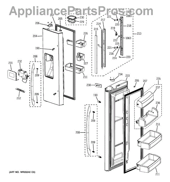 This is an ice chute and funnel assembly for refrigerators with ice dispensers on their doors. The chute opens upon the user's command input and releases ice into a glass or other container placed underneath it. With use, because of misuse, or as a result of accidental damage, part or all of the ice chute door and funnel may malfunction or fail entirely. When this happens, a replacement part is required to continue using the ice dispensing feature.If the ice chute no longer dispenses ice, or if it is dispensing too much or too little ice, it's a good indication that there is something wrong with this part of the appliance. It's a quick repair. It is always recommended to unplug the device before beginning the replacement. Move any food that could spoil while the repair is being completed.This refrigerator ice dispenser ice chute door and funnel assembly is a genuine OEM replacement part. It is sourced directly from the manufacturer. It is sold as an individual unit and made of durable materials. The replacement part is compatible with several models of refrigerators manufactured by General Electric, Hotpoint, and RCA.