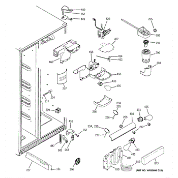 This air diverter is a duct component that directs and balances airflow inside the refrigerator. Replacing a cracked or missing diverter helps restore proper cooling performance and reduce frost or condensation around air passages.