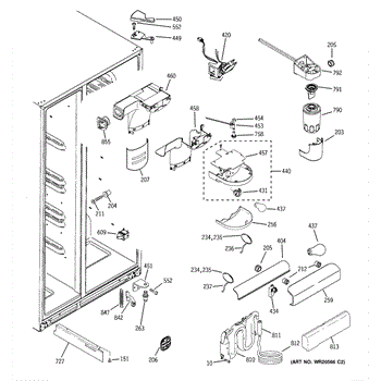 This air diverter is a duct component that directs and balances airflow inside the refrigerator. Replacing a cracked or missing diverter helps restore proper cooling performance and reduce frost or condensation around air passages.