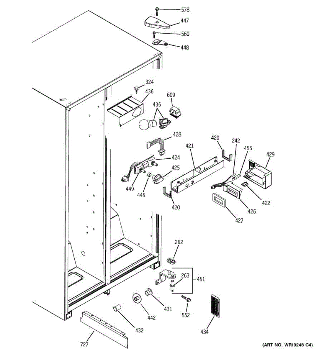 The Light Switch is an OEM replacement part for GE refrigerators. It controls the interior light, turning it on when the refrigerator door is opened and off when the door is closed. This ensures proper illumination for visibility when accessing the refrigerator's contents.