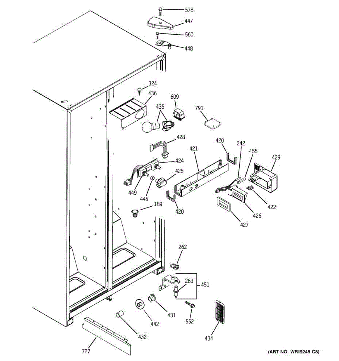 The Light Switch is an OEM replacement part for GE refrigerators. It controls the interior light, turning it on when the refrigerator door is opened and off when the door is closed. This ensures proper illumination for visibility when accessing the refrigerator's contents.