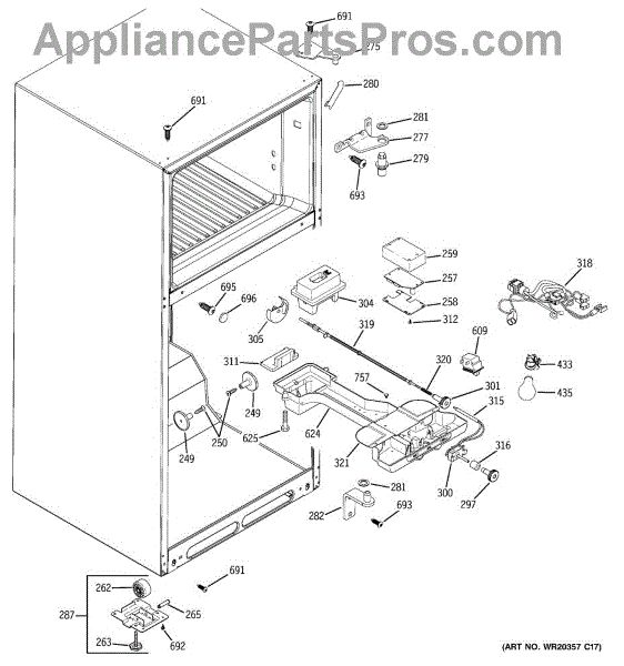 This leveling leg supports and stabilizes the refrigerator cabinet. Adjusting it keeps the unit level so doors align and seal correctly, helping reduce vibration and noise for smoother, more reliable performance.