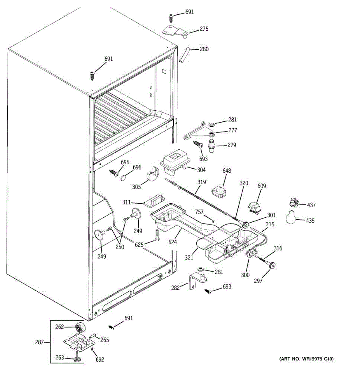 Leveling leg threads into the refrigerator base to support and stabilize the cabinet. Replace if cracked, broken, or worn to keep your unit level.