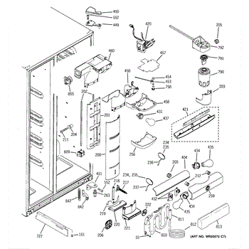 This air diverter is a duct component that directs and balances airflow inside the refrigerator. Replacing a cracked or missing diverter helps restore proper cooling performance and reduce frost or condensation around air passages.